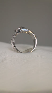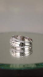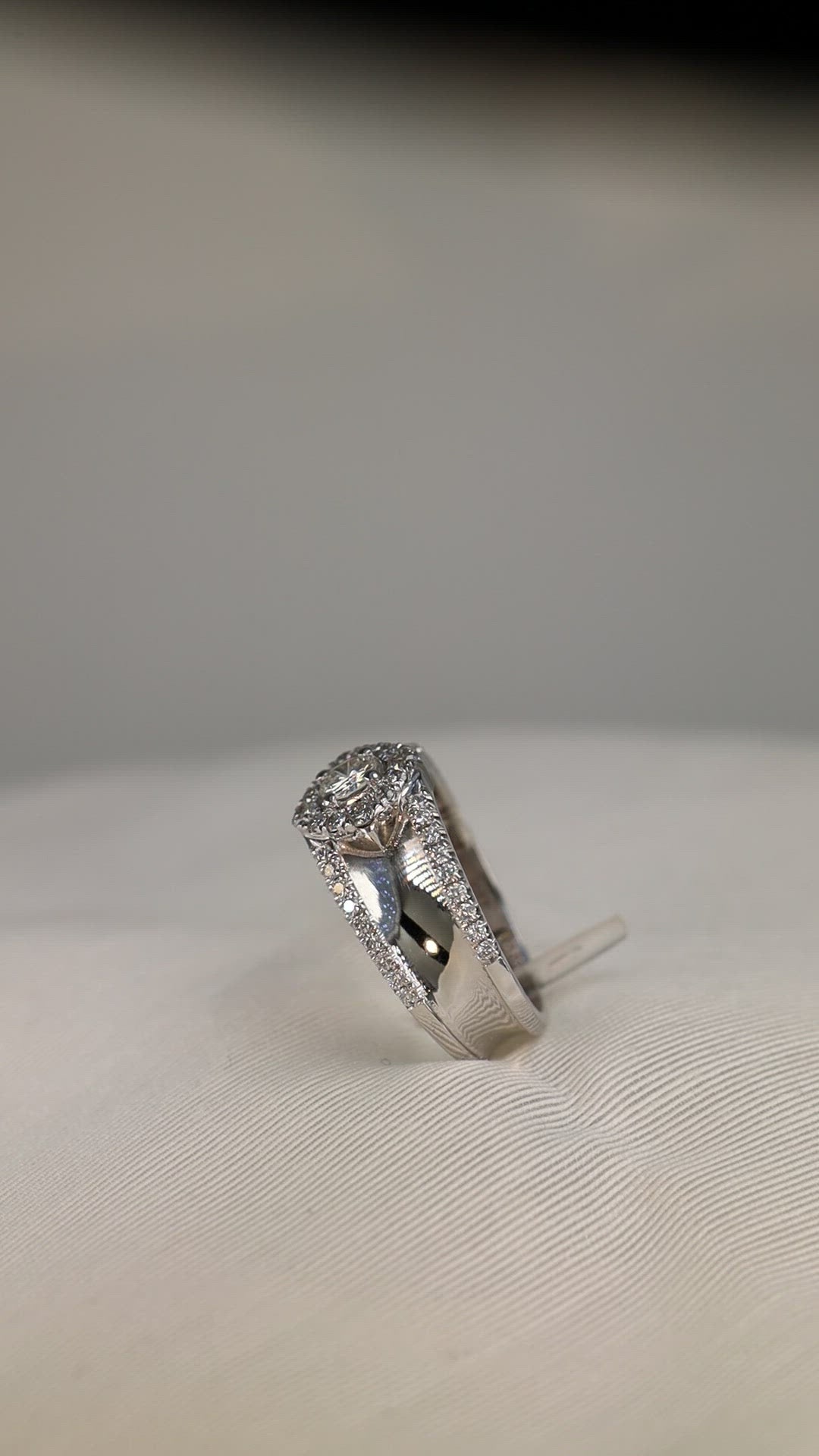 Lessard Coutu exclusive concave 14KT white gold halo diamond ring with a stunning high polish that extenuates the forty-nine diamonds.